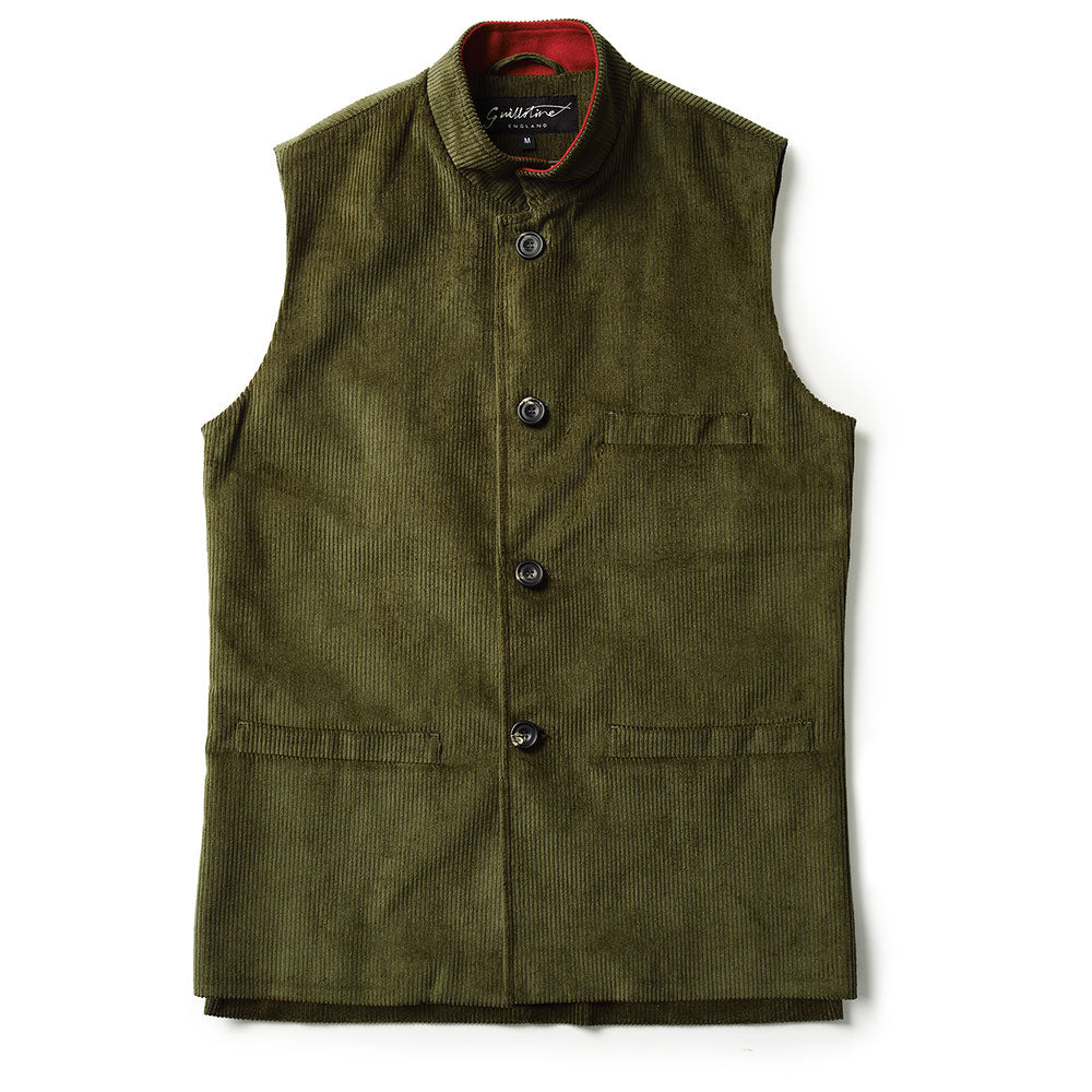 Embrace outdoor elegance with our Corduroy Gilet, tailored for the modern gentleman. Crafted for warmth and weather resilience, this gilet features the Highgrove green 100% cotton 8-wale corduroy outer lining sourced from Brisbane Moss in Lancashire. Inside, discover a luxurious berry pink 100% silk Habotai lining, perfectly complementing the moleskin Nehru collar. It is designed for both style and functionality and boasts practical chest and waist pockets adorned with matching buttons. Each piece is finished with a distinctive Highgrove and Guillotine of England label, marking its exclusivity to Highgrove. Available in seven sizes, this gilet embodies understated luxury and effortless sophistication.