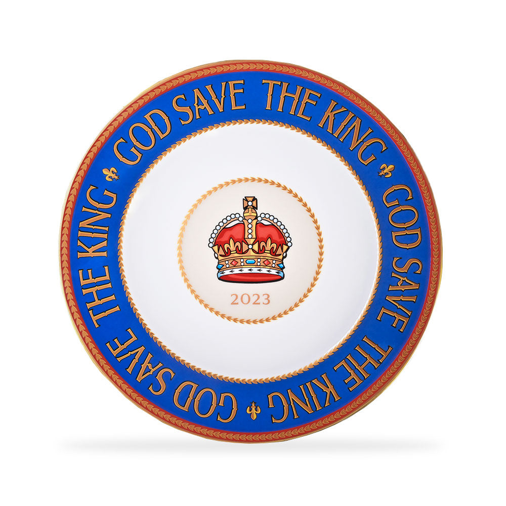 This beautiful 8-inch plate forms part of the esteemed Duchess China's exclusive range of commemorative "God Save The King" fine bone china, celebrating the Coronation of His Majesty The King Charles III.